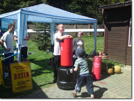 Mittlerweilen ist es zu einer guten Tradition geworden, das der Boxclub Dreiländereck sich im Rahmenprogramm des Zittauer Gebirgslaufes, am Samstag, präsentiert. So auch in diesem Jahr, wenn auch in der abgespeckter Form, da terminliche Überschneidungen eine größere Präsentation nicht zuließen. Cindy, Dawid und Marcel präsentierten, unter der Leitung des Steinaer Trainers Jürgen Rau, mit kleinen Boxeinlagen und Demonstrationen das Trainingsangebot des BCD. Vielen Dank an dieser Stelle an die drei Sportler und besonders an Jürgen Rau.