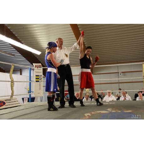 Diesmal 2 Gewichtsklassen höher als üblich, boxte Cindy Petereit gegen die Bautznerin Denise Wölfer (Frauen 60 kg). Cindy boxte aus einer sicheren Deckung und mit guter Beinarbeit und konnte so den stürmischen Attacken ihrer Gegnerin die Wirkung nehmen. Variable Schlagkombinationen, mit denen Sie immer wieder klare Treffer setzte, und eine stetige Leistungssteigerung von Runde zu Runde brachten am Ende den verdienten Sieg.